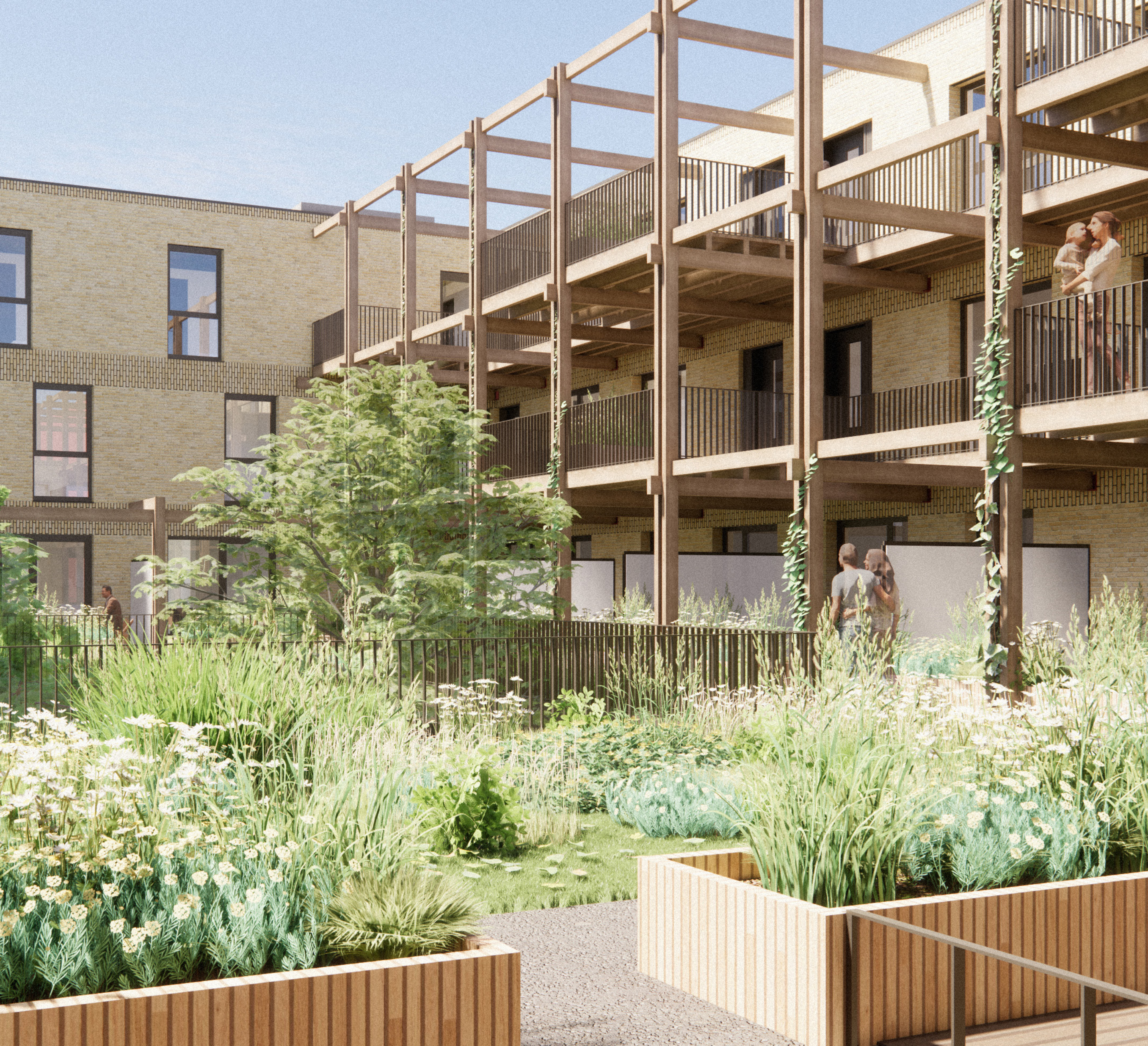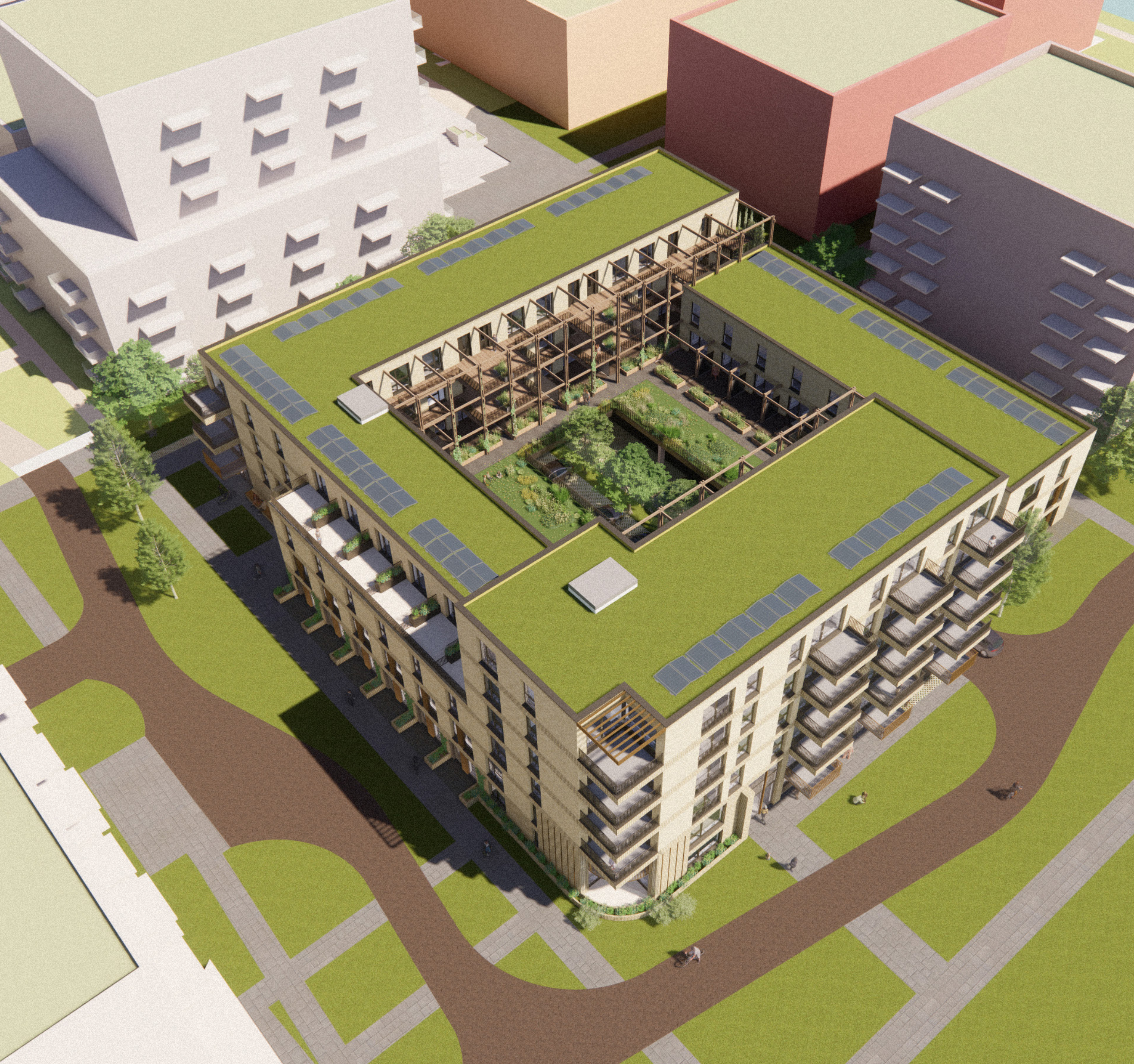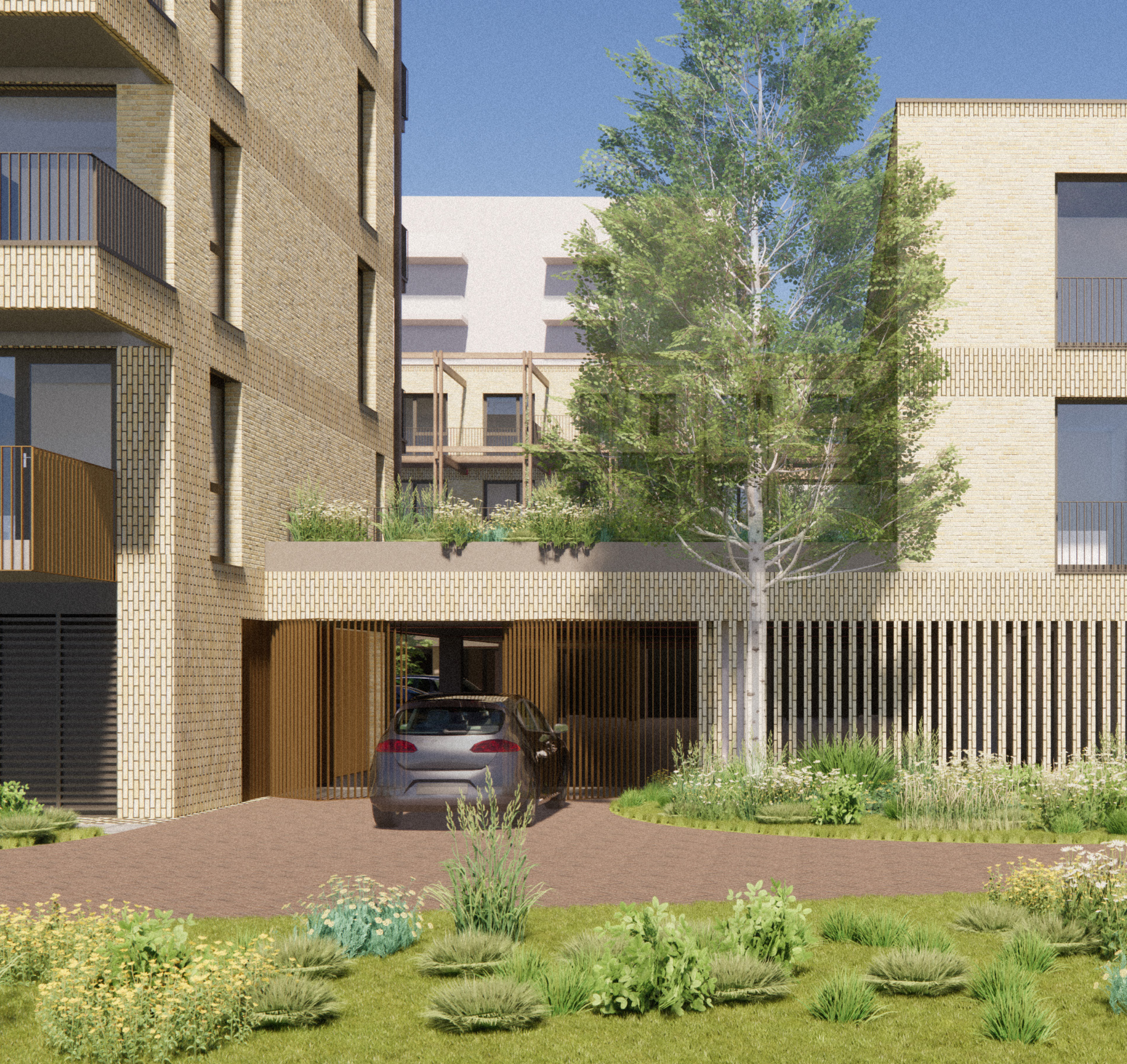 Centraal in het plan ligt een natuurinclusieve, verhoogde hoftuin – het groene hart van het project. Hier geniet je van rust en ruimte, zowel in de zon als in de schaduw. Je eigen buitenruimte grenst aan dit collectieve binnenhof of kijkt hierop uit, met een ruime parkeergarage geheel uit het zicht.