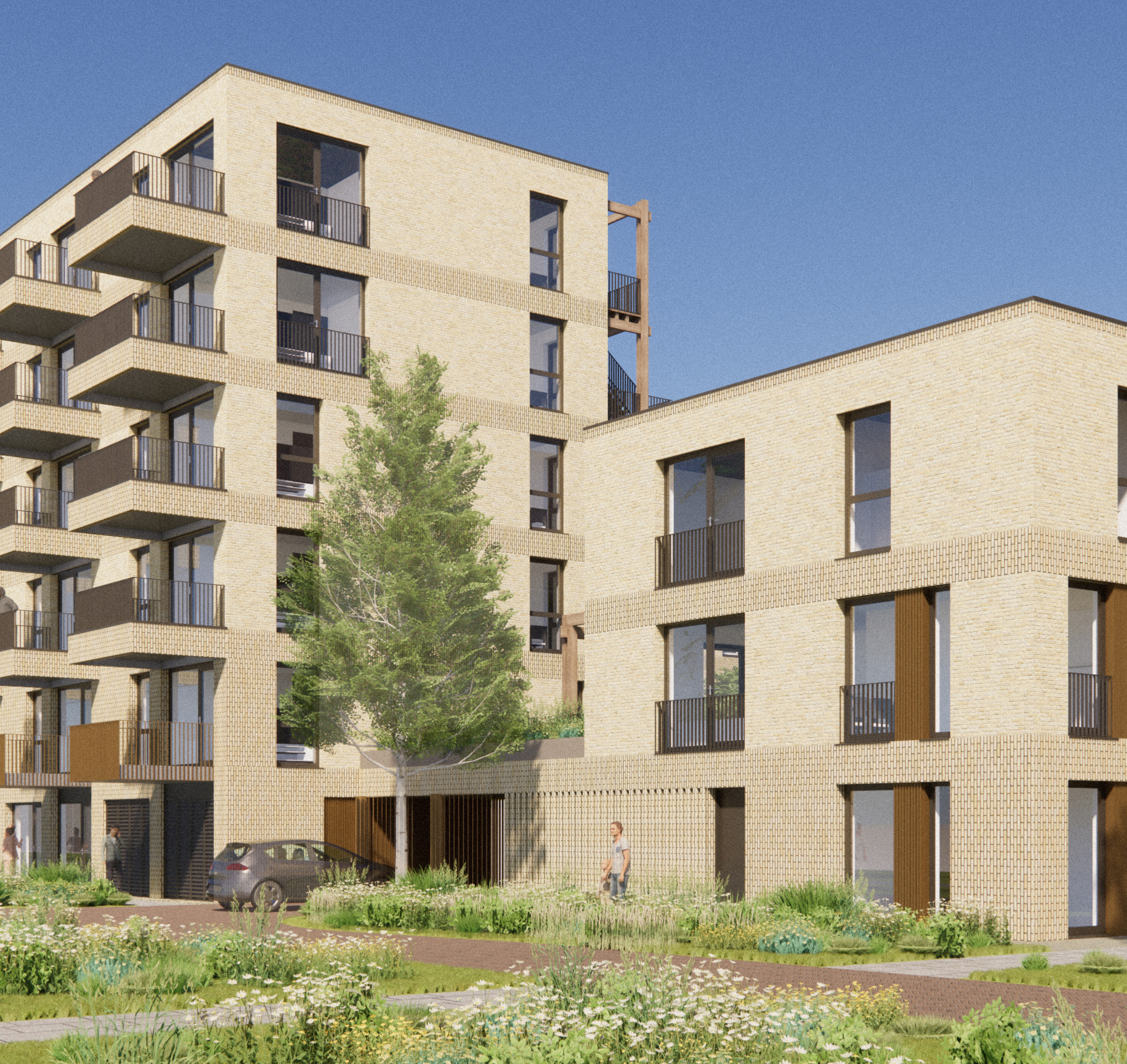 De architectuur is warm en verfijnd, met gemêleerd gele bakstenen, speelse metselverbanden, contrasterende voegen, groenelementen en naturel vergrijzend houten elementen rond het binnenhof. Deze combinatie zorgt voor een krachtig en stijlvol gevelbeeld.